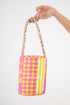 A cylindrical bucket bag, made in Silk and Cotton blend. Featuring the season's signature prints of florals and geos in hues of Marigold and Hot Pink. Finished with braided straps with Kaudi shells.
