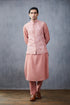 This Gulbaag Faiz Bandi Set is made with an intricate combination of handwoven Chanderi, Cotton Voile, and Cotton Silk. A unique style of Dori Embroidery, Hand Adda Work, and Hand Block Print gives this set its stylish and eye-catching appeal. The set includes a Bandi, Kurta, and Pants, all in a beautiful pink hue.
