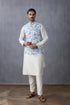 This Neeli Gauraiya Faiz Bandi Set is crafted from luxurious handwoven Chanderi, soft Cotton Voile, and breezy Cotton Silk fabrics. The beautiful ensemble features a quilted Bandi, Kurta, and pants with intricate Digital Print and Hand Block Print work. This stylish set exudes a timeless elegance in its classic blue tone.