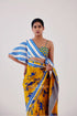 One-of-a-kind rendition of a Saree blouse, it is styled with one-shoulder flared sleeves in signature colors of the season, with a print-play of stripes and chevron. It is paired with our Nargis Saree. Wear it in your own way for a look that is uniquely yours.