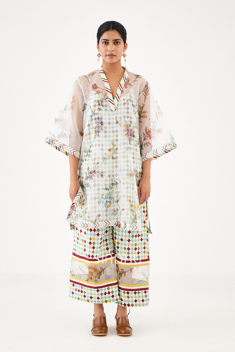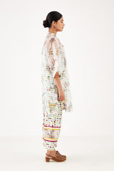 Karula wide-leg Pants are expertly crafted from a combination of Cotton Silk, Cotton Voile, and Silk Organza fabrics. Featuring a signature digital print, these pants offer an elegant look for any occasion. Available in white, they offer a timeless and classic look.