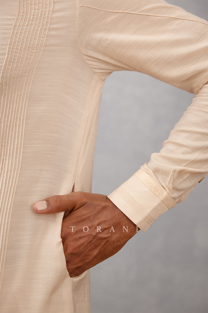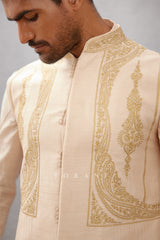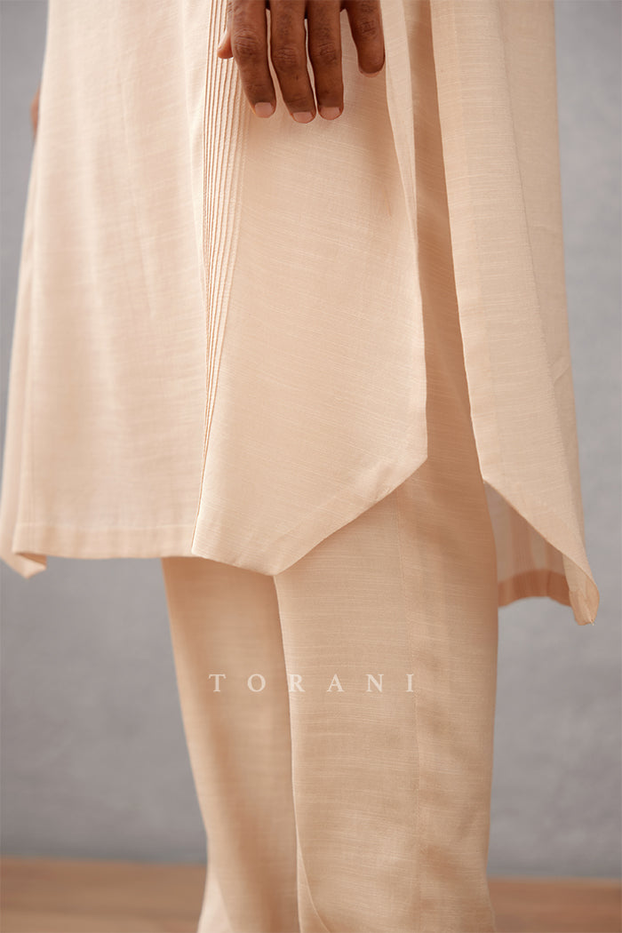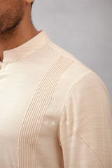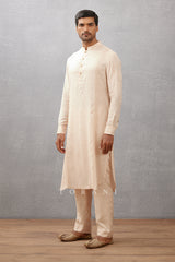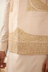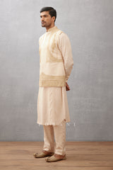 Look sharp in the Mogra Murshid Bandi Set. Constructed with luxurious handwoven chanderi, slub silk and cotton silk fabric and decorated with aari embroidery and pintuck work. This set contains a bandi, kurta and pants, all in ivory. Perfect for formal occasions.