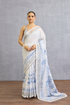 The Neeli Gauraiya Poulami Saree is crafted with a luxurious chanderi fabric, and detailed with intricate digital prints and embroidery. The serene blue florals upon whites looks elegant and ethereal.