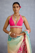 Inspired by the Indian choli, the Gul-Mehr Adrika Blouse is a sophisticated addition to your wardrobe. Crafted with a royal dark pink georgette fabric, this blouse features a unique neckline, embroidered scallop lace-work and tassel details to add an elegant touch to your look.