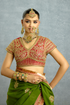 Crafted in richly embroidered red silk, the Zehra Mumtaz Blouse is sculpted to a body-fit silhouette, featuring dense traditional handwork and a refined neckline. The structured form and intricate detailing bring strength and depth to the ensemble, anchoring the softness of the saree with regal balance and heirloom craftsmanship.