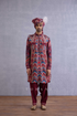 The Coromandel Naitik Kurta Set is crafted with a luxurious silk fabric and features a regal maroon shade, designed with chevron prints and floral motifs.