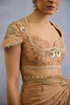 The Kasoori Dilruba Blouse is an intricately embellished blouse, featuring cape sleeves for a unique look. It is crafted with a luxurious jeni silk fabric in an exquisite beige and golden shade.