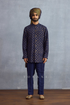 This luxurious Behare Azure Kurta Set is composed of exquisite jeni silk and muslin silk fabrics. It is carefully crafted with golden boota block print on the kurta to add a luxurious yet understated and elegant finish. The navy blue hue adds a subtle sophistication to this beautiful set, which includes a short Kurta & Pants.