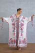 The Coromandel Kanika Kaftan is an exquisite find for your summer days. Crafted with a soft breathable linen fabric, the kaftan is detailed with digital chintz prints in a bright combination of red blue and white. It is further enhanced with lace work and floral embroidered border.