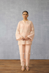 This Gul-Mohar Aabia Co-ord Set features exquisite hand embroidery and dori embroidery on a soft linen fabric. The soft peach color makes this classic piece a must-have for any wardrobe. Perfect for special occasions, it retains its elegance and beauty for years to come.