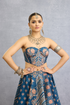 The Neelam Charvi Corset is a traditional take on the moderna attire, and features intricate floral prints on a teal-toned, dark blue jeni silk fabric. Wear it as a choli, or pair it with a saree or even a pair of pants, this one is a statement piece for every occasion.