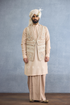 The Noore Ratul Dhoti Set is a beautiful blend of traditional and modern styles. Meticulously crafted from jeni silk, the set features a peach hue and intricate golden doria, hand-embellished with dabka work. The set includes a bandi, kurta, and a dhoti to complete the ethnic look with a modern twist.
