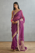 This Gul-Rez Taashi Saree is crafted from a combination of silk organza, cotton silk, and butterfly net fabric. Hand embroidery, dori embroidery, and hand adda work decorate the gorgeous violet exterior. Enjoy beauty and durability for your next special occasion.