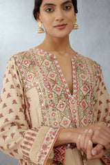 Look timelessly elegant in the Kasturi Bushra Kurta Set. Crafted from cotton silk and featuring a beautiful musk beige digital chintz print, this set is further accentuated with panels and heavy hand yoke embroidery. Add to this a matching handwoven chanderi salwar and cotton kota odhani to complete the ensemble.