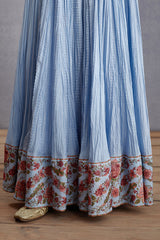 The Samsara Dhuni Dress is crafted from luxurious handwoven Chanderi and Cotton Voile, creating an elegant piece with a timeless look. This dress is decorated with a subtle yet eye-catching digital print in a beautiful blue hue. Perfect for special occasions, this piece is sure to make a statement.