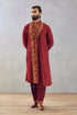 This Gulnar Arham Kurta Set will bring a unique style to your wardrobe. The Burgundy Bhagalpuri Printed Kurta is designed with a draped collar and Chevron Printed Salwar in Raw Silk for ultimate comfort. The fabric, Viscose Raw Silk, is digtally printed with Bhagalpuri Print and draping for a charming look. Perfect for any special occasion, this red set will dazzle any ensemble.