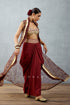 Upgrade your wardrobe with the Gulnar Nazreen Cape Set. This beautiful set features a burgundy Bhagalpuri printed sheer cape with slub silk bralette and dhoti-style bottoms. Crafted from silk organza, silk slub and finished with delicate hand Adda work and Gota detailing - it offers style, comfort and luxury. The set includes a cape, bralette and dhoti in vibrant red.
