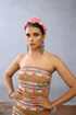 This Dil Ruba Fareeda Mathapatti is an amalgamation of the Frida Kahlo-Amrita Shergil aesthetic. Crafted in Handwoven Organza tassles, the embellishments are intricately Hand-embroidered for a sumptuous texture, making it a one-of-a-kind piece.