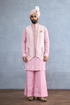The Sharbati Faizan Bandi Set is a beautiful blend of traditional and modern style. Meticulously crafted from jeni silk and muslin silk, the set features a pastel pink shade with intricate golden doria, hand-embellished with dabka work. The set includes a bandi, kurta, and pants to complete the ethnic look with a modern twist.