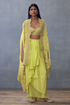 The Gul-Mina Zuri Cape Set is crafted from luxurious fabric featuring Silk Organza, Silk Crepe, Slub Silk, and Raw Silk. Featuring intricate Dori Embroidery and Hand Embroidery, as well as Hand Adda Work and Draping, this ensemble comes in a striking yellow hue. The set includes a cape, dhoti, and blouse. Show off your style and make a statement with this exquisite ensemble.
