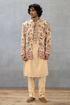 This Kasturi Mehtab Jacket Set is the perfect combination of quality and style. Handwoven from luxurious Chanderi cotton silk, and cotton voile, and featuring quilting, digital print, and hand block print, this elegant 3-piece set exudes timeless elegance. The beige colour of this ensemble makes it suitable for any occasion, from casual days to formal events. Paired with a jacket, kurta and pant, you’ll always look stunning in this ensemble.