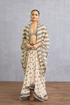The Kalamkari Zaira Cape Set is a luxurious statement outfit, crafted with comfortable silk crepe and silk crepe organza fabric. The set features a cape, blouse, and a dhoti– all designed with timeless kalamkari prints