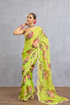 The Angoori Rupal Saree is crafted with a luxurious viscose organza fabric in a beautiful parrot green shade. The saree features big floral prints and embroidered scalloped borders, offering a classy look to the overall ensemble.