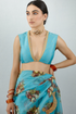This Firoza Nanki Blouse is perfect for any special occasion. Hand and machine embroidered on Chanderi fabric, it is lightweight with a bright blue hue that will liven up any outfit. The intricate embroidery also adds a touch of sophistication.
