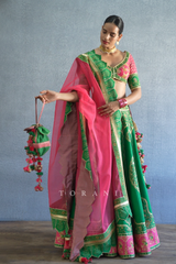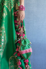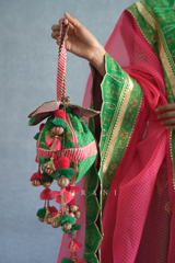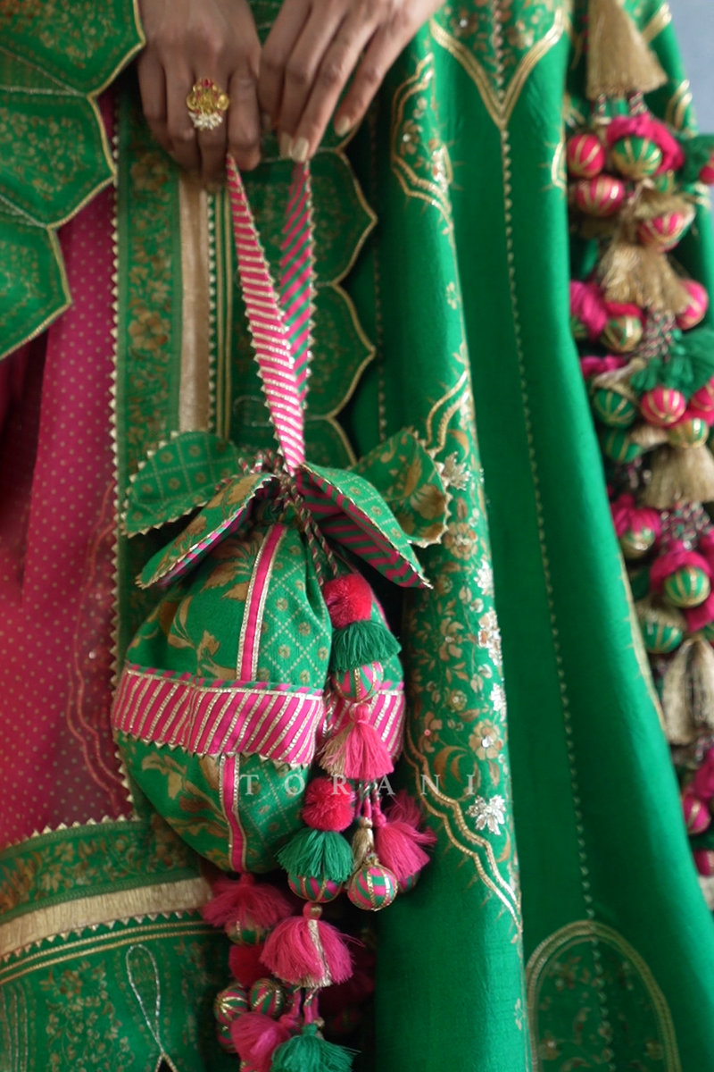 Experience elegance with the vibrant Rang Naaz Iqra Potli, crafted with a beautiful blend of Handwoven Chanderi and Cotton Silk fabric. This eye-catching potli is decorated with a distinctive Digital print and Gota embroidery in vivid green. Perfect for any occasion!