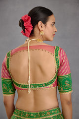The Rang Raas Mahnaz Blouse is a unique combination of silk organza, Gota embroidery, hand adda work, and Bhagalpuri digital print. This stunning blouse comes in a beautiful pink color and is perfect for a sophisticated and elegant look. The luxurious fabric ensures a comfortable and flattering fit.