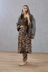 Introducing the Gulghast Barkha Kurta Set, an elegant outfit crafted from slub silk featuring a subtle digital Bhagalpuri print in black. The set includes a kurta, pants and odhani for a complete, graceful look. Flaunt this timeless piece and make sure to turn heads wherever you go.