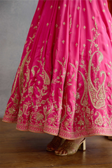 The Padma Zohra Anarkali Set is beautifully crafted from Muslin Silk and Chinon Georgette. It includes an anarkali, churidaar, and odhni. The Anarkali and Odhni feature intricate hand embroidery with pearl, zari, and dori embellishments, adding timeless charm to your look for any occasion.