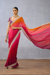 Redefining elegance in the shades of the season with Torani Classics. Crafted in the finest georgette fabric, the Saroj Ismi Saree is embroidered and finished with fine details. The beautiful ombre hue of this saree will definitely make heads turn.
