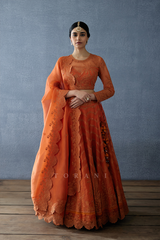 This Kesari Indira Lehenga Set is a unique statement piece, crafted using the luxurious fabrics of silk organza and cotton silk. This set features intricate dori embroidery and hand embroidery of banana and palm tree motifs, in a rich tone-on-tone orange hue that creates an effect of striking elegance in one gaze.