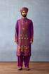The Dil Saaz Farid Kurta Set is a piece of stately elegance; it exudes luxury. With gorgeous, one-of-a-kind prints crafted in jeni silk, the kurta boasts a gorgeous, vintage purple hue. Paired with a slub silk salwar in the same tone, the set stands out in its unique approach to traditional menswear.