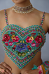 The heart-shaped Dil Nawaz Arsia Bralette is a chic addition to any wardrobe. Crafted from Jeni Silk, this blue bralette exudes elegance and femininity, making it a perfect complement to the saree.