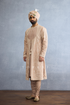 The Noore Azeez Kurta Set is crafted from the finest Jeni silk and muslin silk, featuring a gorgeous rustic peach hue accentuated with golden doria, dabka, and intricate embellishments for a distinctive finish. This set includes a kurta and churidaar, blending heritage traditions with contemporary Indian menswear.
