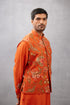 This Narangi Faiz Bandi is made from luxurious fabrics like raw silk, cotton silk, and cotton voile for a beautiful look. The vibrant orange color brings a pop of energy to any outfit. It's finished with a digital print and quilting for an elegant touch.