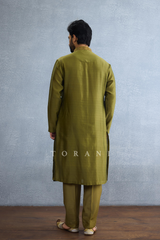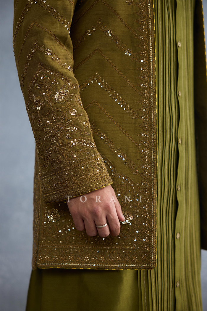The luxurious Samze Vasl Jacket Set is made from exquisite green jeni silk and muslin silk fabrics. It includes a Bandhgala Jacket, Kurta, and Pants. Crafted with heritage dori and dabka, it offers a luxurious yet understated finish.