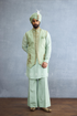 The Pushta Faizan Bandi Set is a perfect blend of traditional and modern style. Meticulously crafted from Jeni silk, it features a pista green hue accented with intricate golden doria and hand-embellished dabka work. The set includes a bandi, kurta, and pants, offering an ethnic wear look with a contemporary twist.