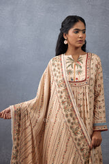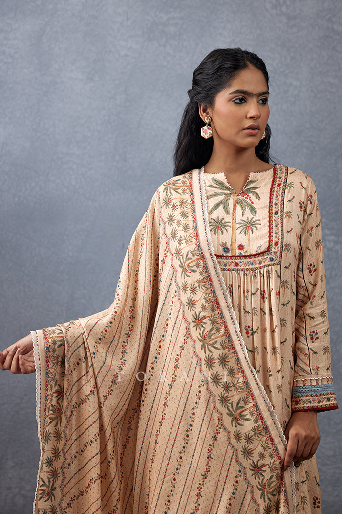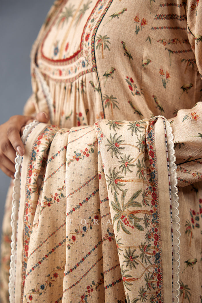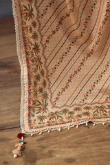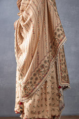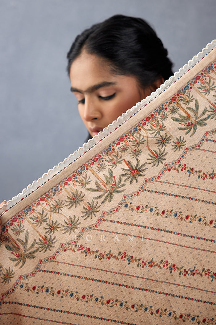 This Badami Tara Odhni is crafted from a blend of Slub Silk and Cotton Silk, hand block printed in Beige with a Digital print. Its exquisite fabric and unique pattern create a stunning and timeless piece.