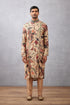 This Chandan Zahir Kurta Set is crafted from a luxurious cotton silk fabric, handwoven Chanderi, and designed with a digital print, and intricate bidding, in a beautiful beige color. The set includes a kurta and pants, making it the perfect choice for a special occasion.