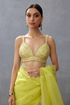 Crafted from luxurious Raw Silk and Cotton Silk, the Gul-Mina Nayantara Bralette is an ideal choice for special occasions. Embellished with intricate Hand Embroidery, Dori Embroidery, and Hand Adda Work, this timeless yellow piece is sure to turn heads.