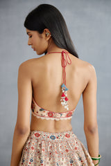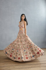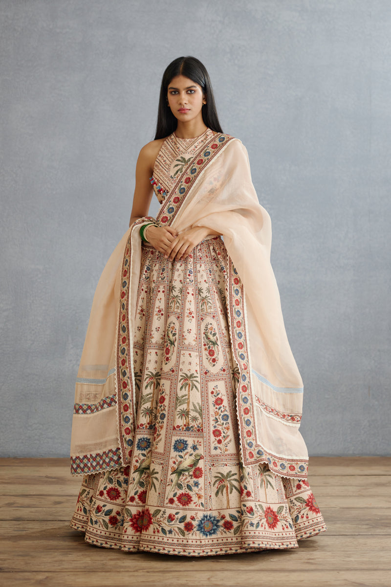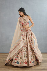 Introducing the Badami Tarini Lehenga Set in a beautiful beige color. This exquisite ensemble is crafted with a combination of raw silk, cotton silk, silk organza, and handwoven chanderi fabrics, intricately designed with a digital print technique. The luxurious design highlights its fine craftsmanship, sure to be a timeless addition to your wardrobe.