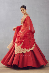 Be the envy of all in the elegant Sindoori Brinda Lehenga Set, crafted with luxurious slub silk, butterfly net, and silk organza. This classic set features exquisite Dori embroidery and hand adda work, all in an eye-catching red hue. Be sure to turn heads at your next event.