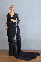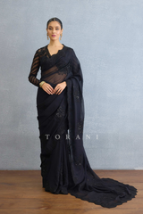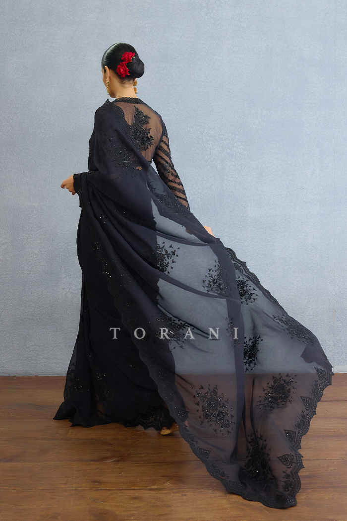The Bhadra Chitrini Saree is crafted with a classy black georgette fabric. It is punctuated with black cutdana, dabka and dori work. The enchanting appeal of this saree is truly one-of-a-kind and gives an elegant look to your festive occasion.