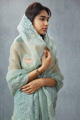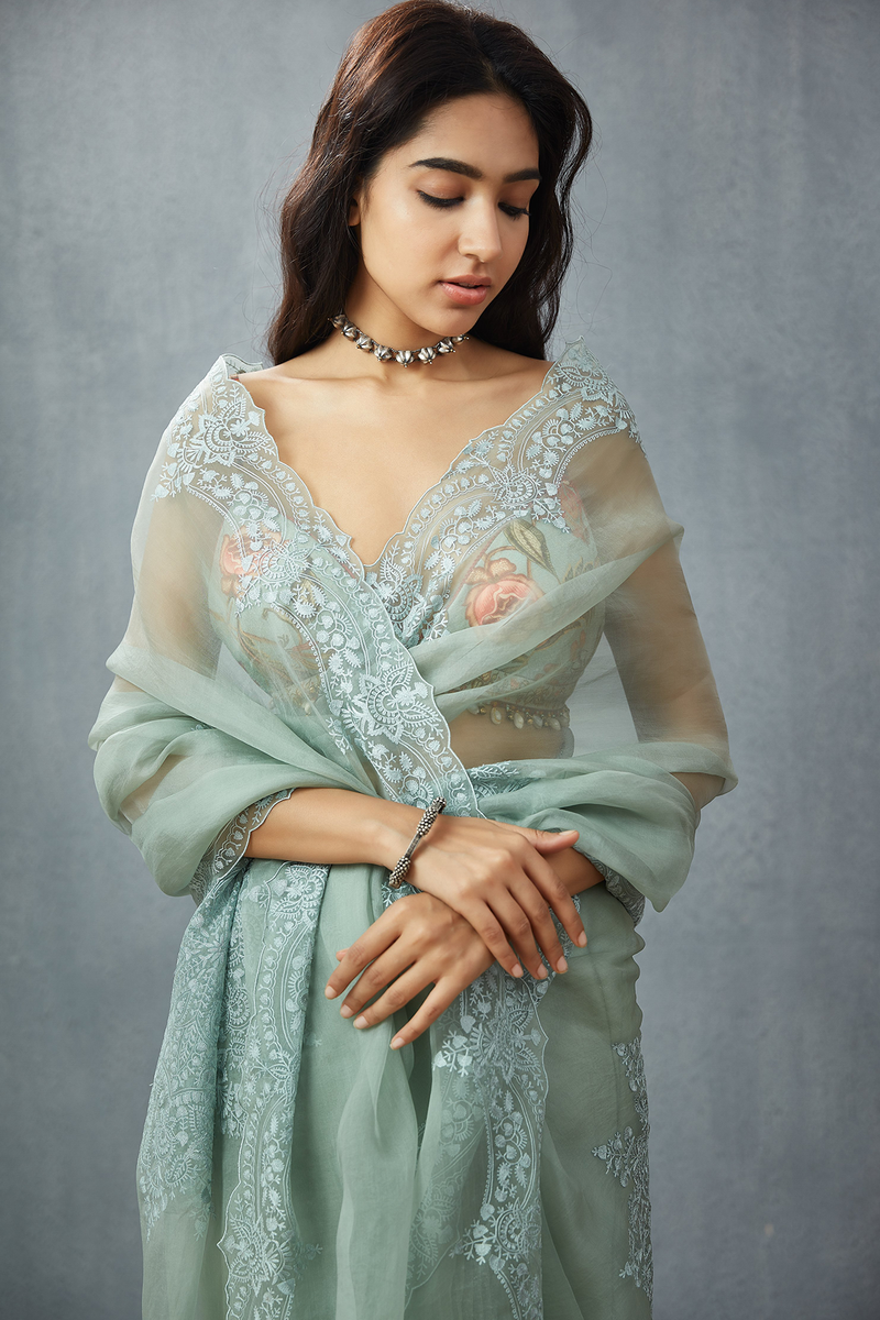 This Champa Yuvani Saree is expertly crafted from 100% silk organza in an eye-catching green hue. Perfectly finishing the look, it features an exquisite aari embroidery design. Be ready to turn heads in this unique and elegant creation.