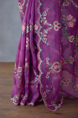 Redefining elegance in every shade with Torani Classics. Crafted from organza and adorned with intricate embroidery, the Dil Kusha Safiyaa Saree is a perfect blend of luxury and style. Its rich purple hue makes it a must-have for your wardrobe