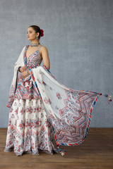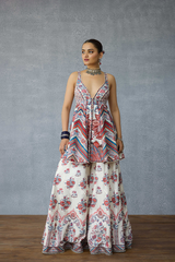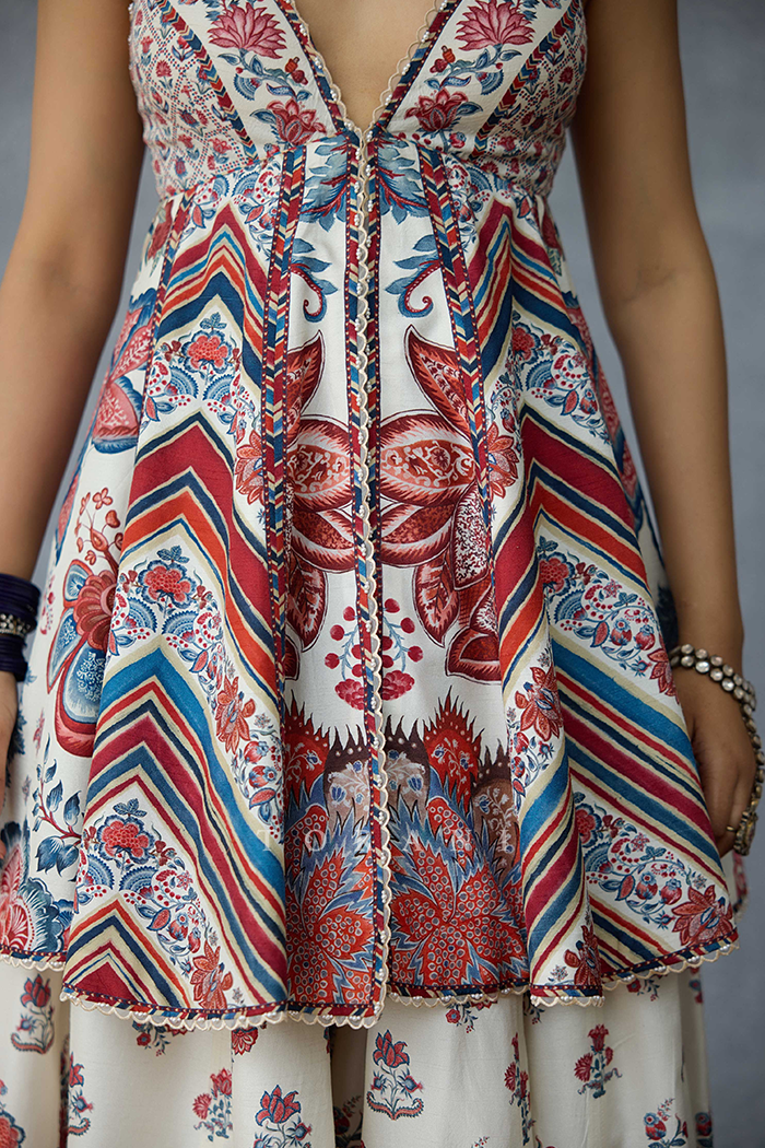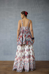 The Coromandel Charu Sharara Set comprises of a peplum top, a flowy sharara and an odhni. The peplum top and sharara is crafted with Dola Silk fabric, whereas the odhni is crafted with a silk crepe organza fabric. It is digitally printed with signature Torani chintz print in monochrome.The combination of these fabrics ensure utmost comfort for you during the summers, also offering a stylish look for the season.