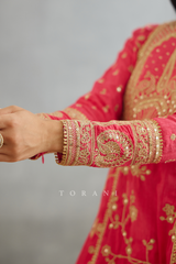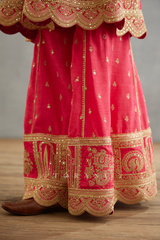 The Gul-Kand Meera Sharara Set features luxurious pink raw silk and butterfly net fabric, finished with intricate hand embroidery, dori embroidery, and hand adda work. Beautifully handcrafted to perfection, this set is perfect for any festive occasion.